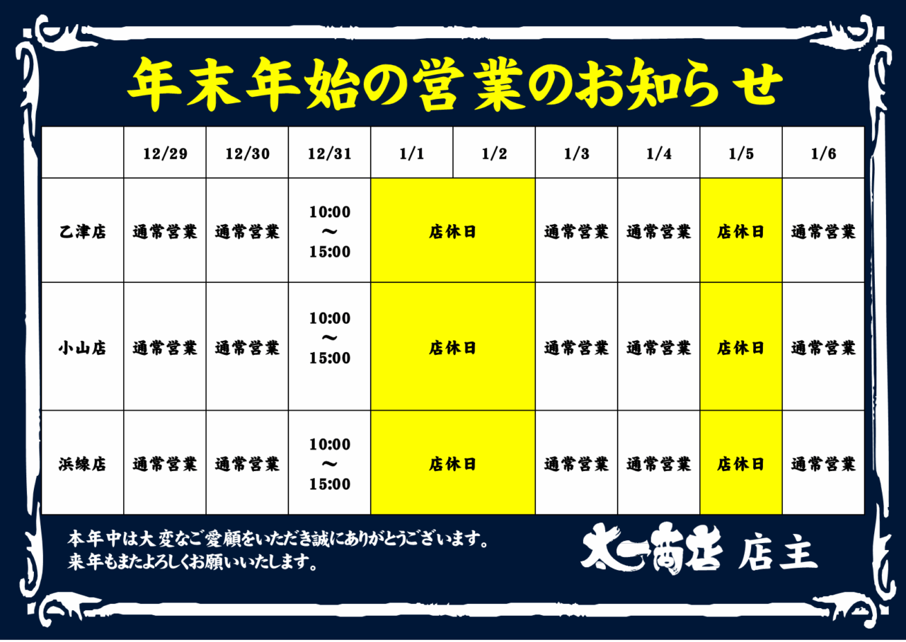 2026年も皆様の胃袋に貢献し続けることをお約束します!! 乙津店・小山店・浜線店の年末年始の営業はこちらからご確認ください。