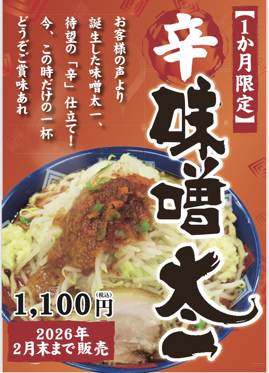 太一商店からのお知らせ 日頃から太一商店をご愛顧いただきありがとうございます。 期間限定「味噌太一」が最後の1ヶ月を迎えます。 そこでお客様より誕生した味噌太一、待望の「辛」仕立て! 今この時だけの1杯どうぞご賞味あれ! 2月1日から1ヶ月間「味噌太一」と「辛味噌太一」の2本柱いきます。 今後も満腹保障はお約束し続けます。 これからも太一商店をよろしくお願い致します!!