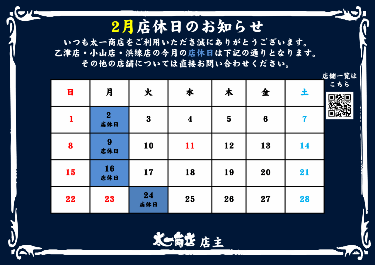 乙津店・小山店・浜線店の2月の店休日は上記の通りとなります。